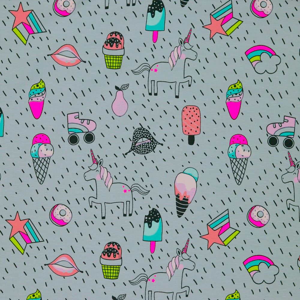 Här har du riktigt goa vibes. Vi snackar glass, enhörningar, och bara allmänt festligt, dessutom går allt i härliga neonfärger. Rullskridskon är ca 3 cm hög. Trikåtyg i en typisk tights/t-shirt-kvalite, med en stretch som gör att det lämpar sig både till tightare och lösare plagg. Det är mjukt, följsamt och framförallt väldigt bekvämt.