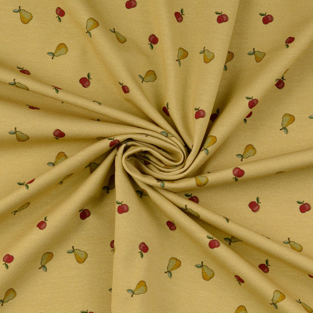 Här har någon varit ute i trädgården och skördat. Äpplena är runt 1cm höga och päronen ca 1,5cm. Färgerna är mjuka, milda och minner lite om förr. Du vet den romantiska tiden förr. Ett trikåtyg i en typisk tights/t-shirt-kvalité, med en stretch som gör att det lämpar sig både till tightare och lösare plagg. Det är mjukt, följsamt och framförallt väldigt bekvämt.