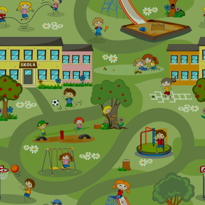 Barndomens skolgård. Vad gjorde du på rasten? Spelade fotboll, lekte kurragömma etc? Skolbyggnaden är ca 16cm. Digitaltryckt bomullstrikå av hög kvalitet. Passar bra till klädsömnad mm.