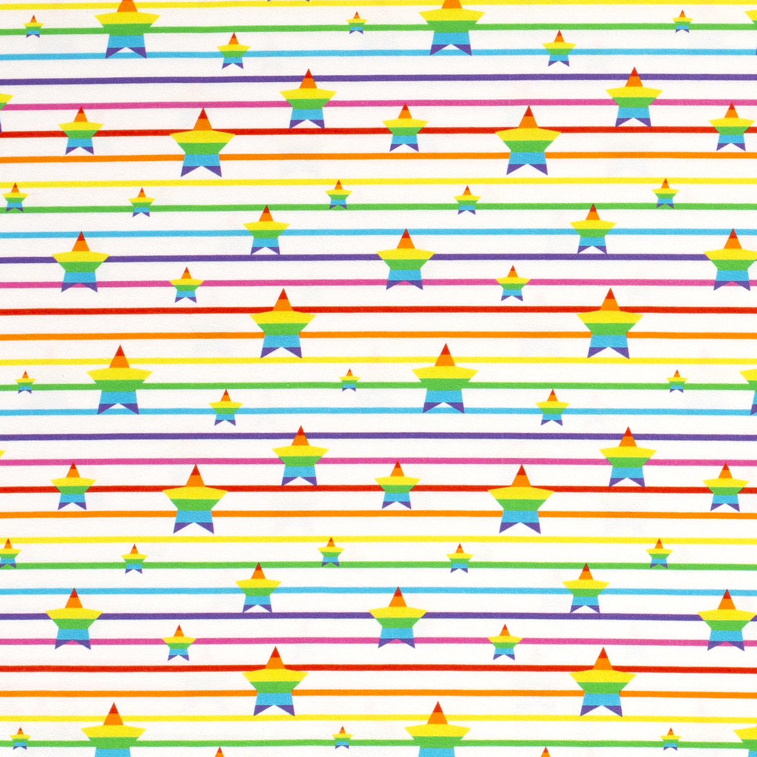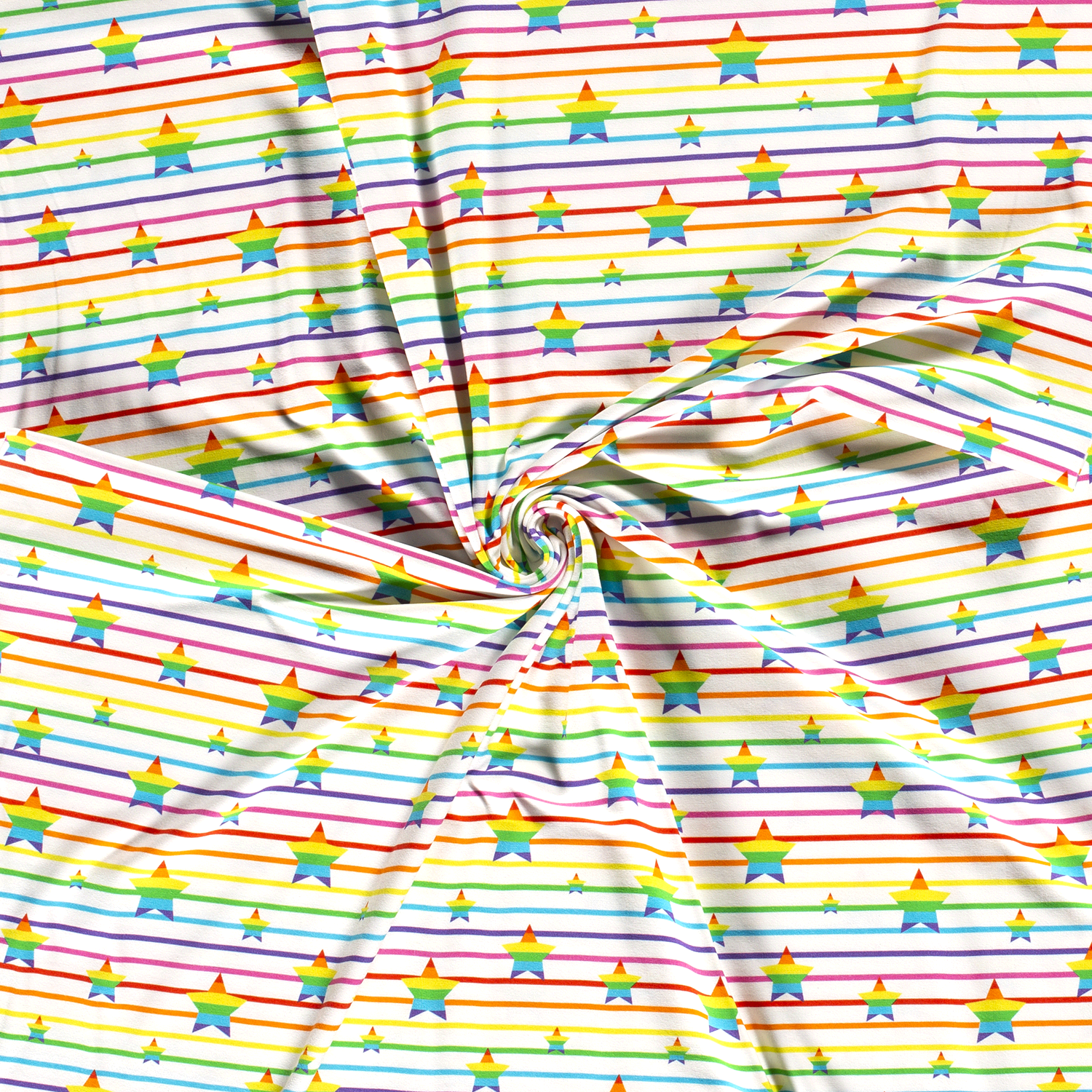 [vc_row][vc_column][vc_column_text text_larger=”no”]Stjärnor och ränder i regnbågens alla färger. Väldigt somrigt, nästan att man tycker sig se glassfläckarna redan. Ett trikåtyg i en typisk tights/t-shirt-kvalite, med en stretch som gör att det lämpar sig både till tightare och lösare plagg. Det är mjukt, följsamt och framförallt väldigt bekvämt.[/vc_column_text][/vc_column][/vc_row]