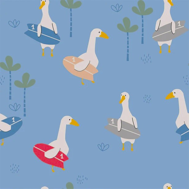 Det är väl kanske inte varje dag en stöter på sufande ankor, men här har du dem! Surfarna är ca 4cm höga. Ett trikåtyg i en typisk tights/t-shirt-kvalite, med en stretch som gör att det lämpar sig både till tightare och lösare plagg. Det är mjukt, följsamt och framförallt väldigt bekvämt.