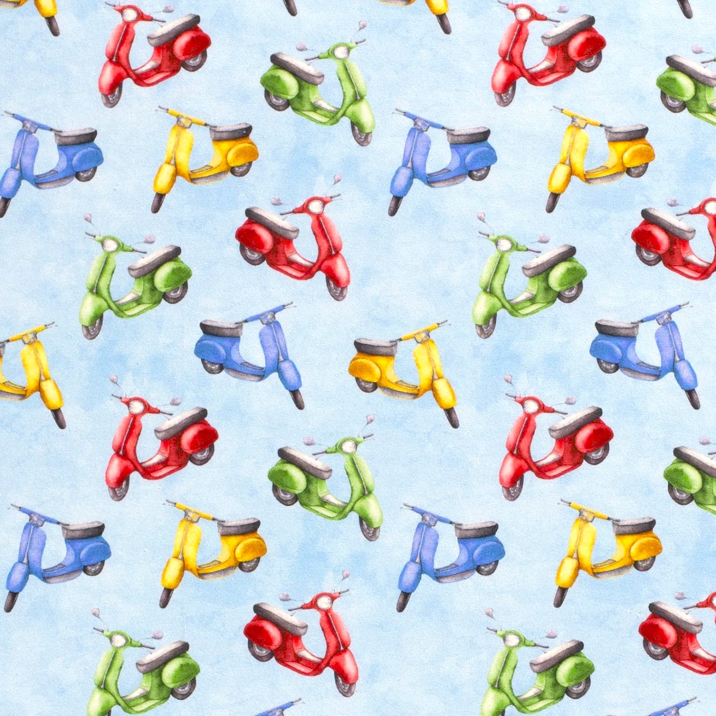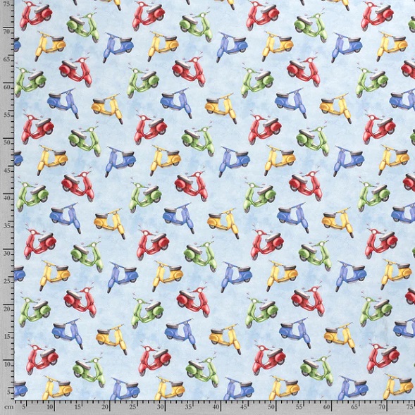 Älskade, älskade vespor. Här presenteras dem, som om målade i aquarellfärger. Ett trikåtyg i en typisk tights/t-shirt-kvalite, med en stretch som gör att det lämpar sig både till tightare och lösare plagg. Det är mjukt, följsamt och framförallt väldigt bekvämt.