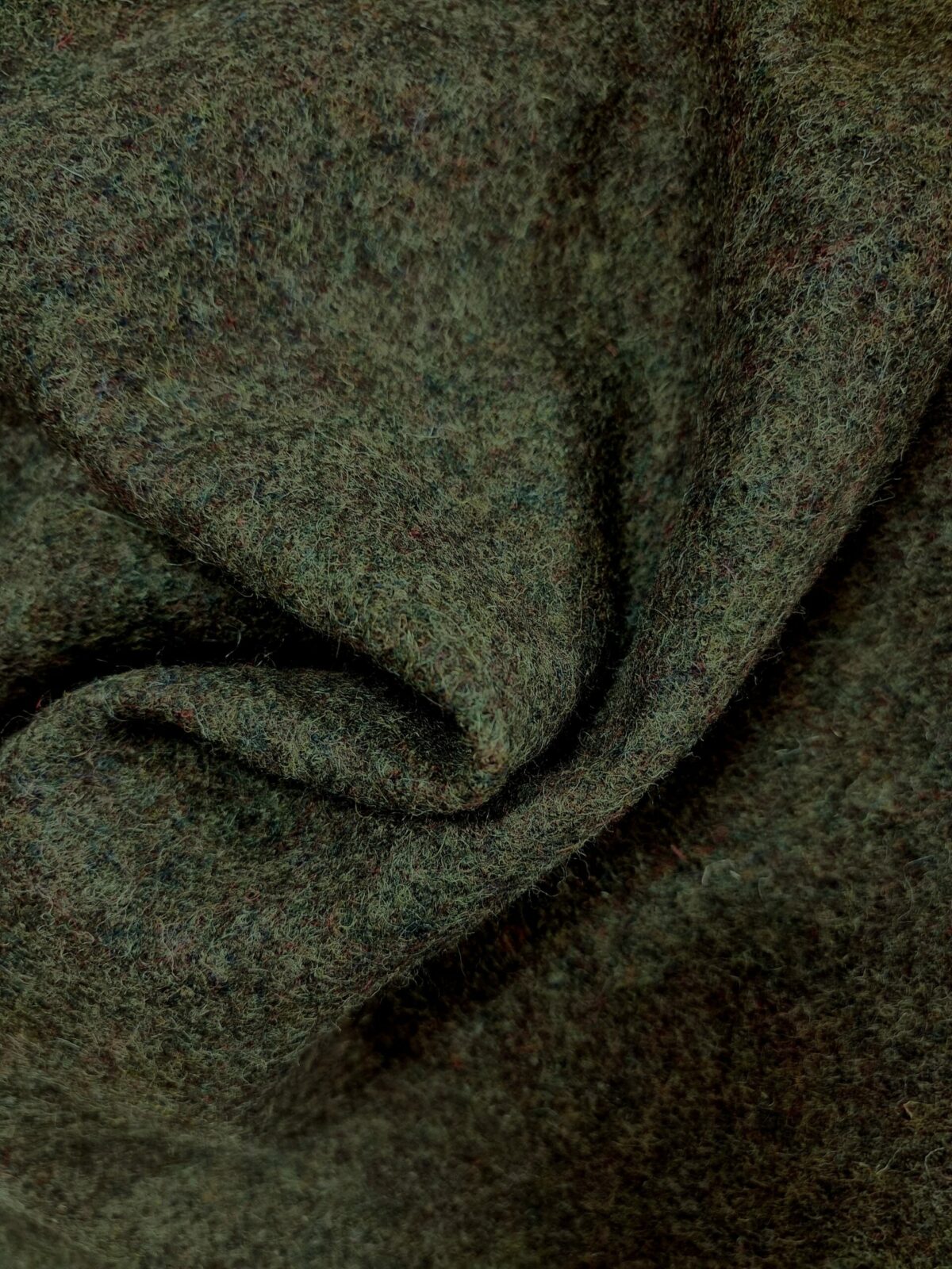 En lite kraftigare stickad och valkad ullvara. Valkad ull är samma som kokt ull och betyder helt enkelt att ullen efter att den stickats krympts ihop med hjälp av fukt och värme. Denna process gör att ullen både blir tätare och starkare, samt i det här fallet att den får en väldigt fin liten bucklig/knagglig yta. Eftersom den är stickad blir den automatiskt lite stretchig, men inte såpass stretchig att den funkar till tighta plagg. Detta trevliga och klassiska tyg kommer absolut bäst till din rätt i form av en kappa, en kofta, en mösssa, en tröja etc.