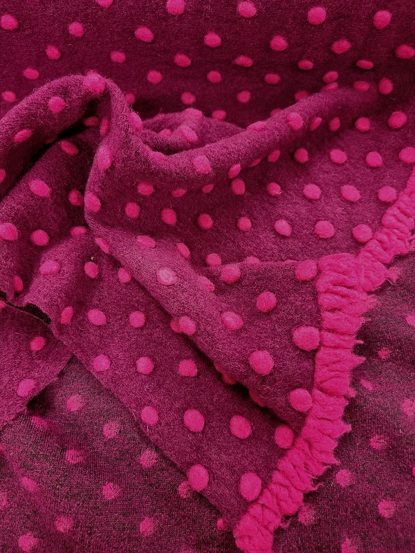 En lite kraftigare stickad och valkad ullvara med ljuvliga pluppar. Valkad ull är samma som kokt ull och betyder helt enkelt att ullen efter att den stickats krympts ihop med hjälp av fukt och värme. Denna process gör att ullen både blir tätare och starkare. Eftersom den är stickad blir den automatiskt lite stretchig, men inte så pass stretchig att den funkar till tighta plagg. Detta trevliga tyg kommer absolut bäst till din rätt i form av en kappa, en kofta, en mössa, en bylsig tröja etc.