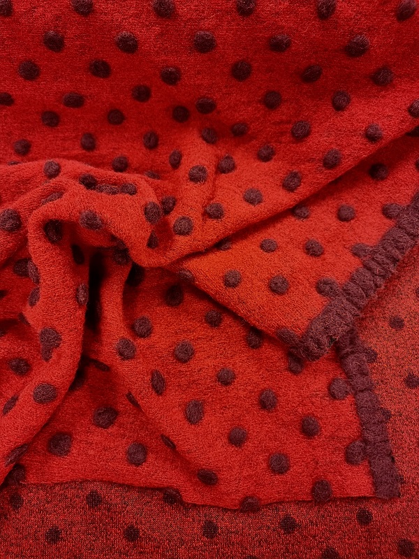 En lite kraftigare stickad och valkad ullvara med ljuvliga pluppar. Valkad ull är samma som kokt ull och betyder helt enkelt att ullen efter att den stickats krympts ihop med hjälp av fukt och värme. Denna process gör att ullen både blir tätare och starkare. Eftersom den är stickad blir den automatiskt lite stretchig, men inte så pass stretchig att den funkar till tighta plagg. Detta trevliga tyg kommer absolut bäst till din rätt i form av en kappa, en kofta, en mössa, en bylsig tröja etc.
