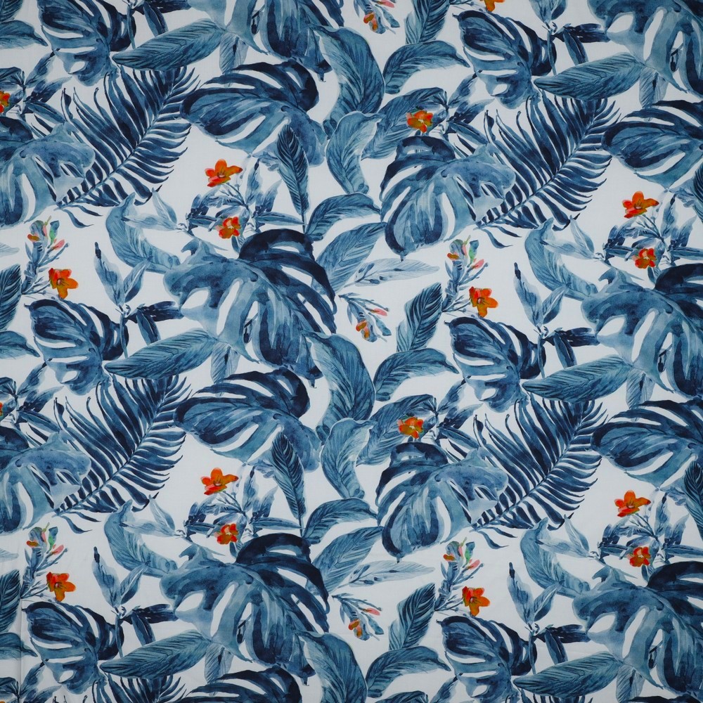 Tropiska motiv men i svala toner. Största blomman är ca 3,5cm stor. Ett lite tunnare, riktigt mjukt, fladdrigt vävt viskosetyg med bra fall. Tänk dig blusen, vida byxan, byxdressen, kaftanen, långskjortan, klänningen etc.[/vc_column_text][/vc_column][/vc_row]