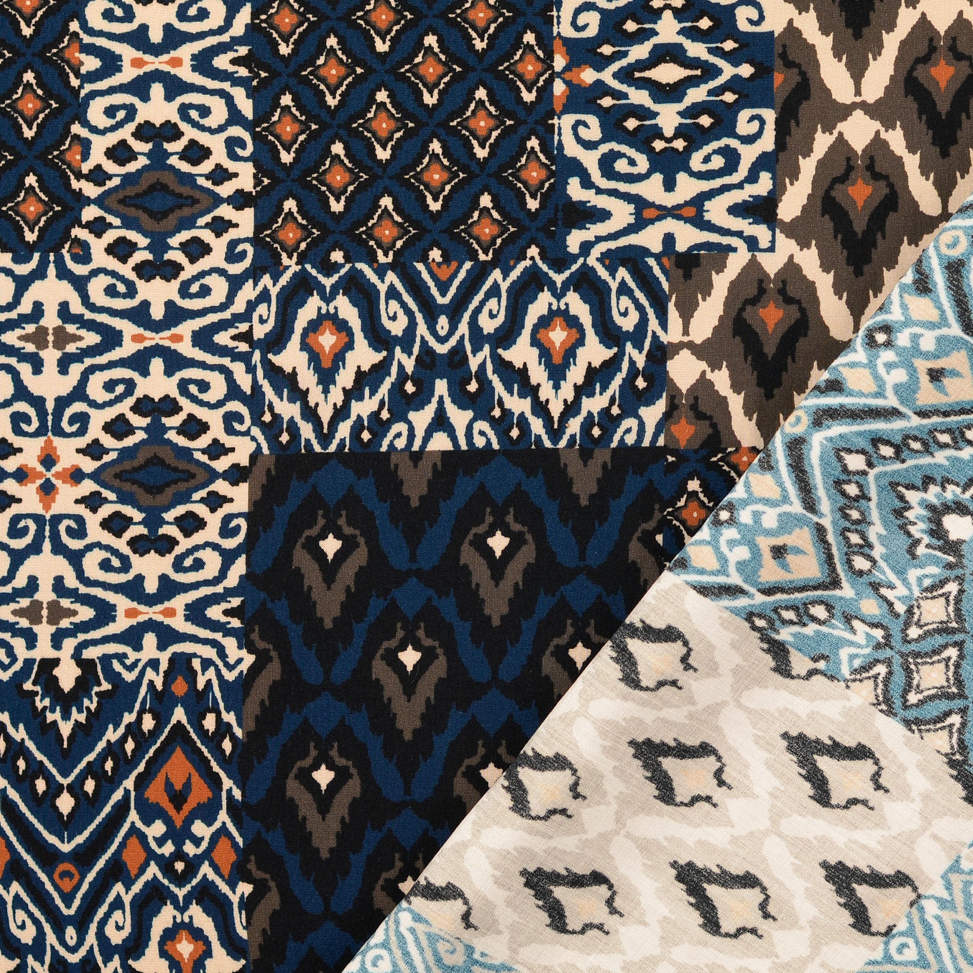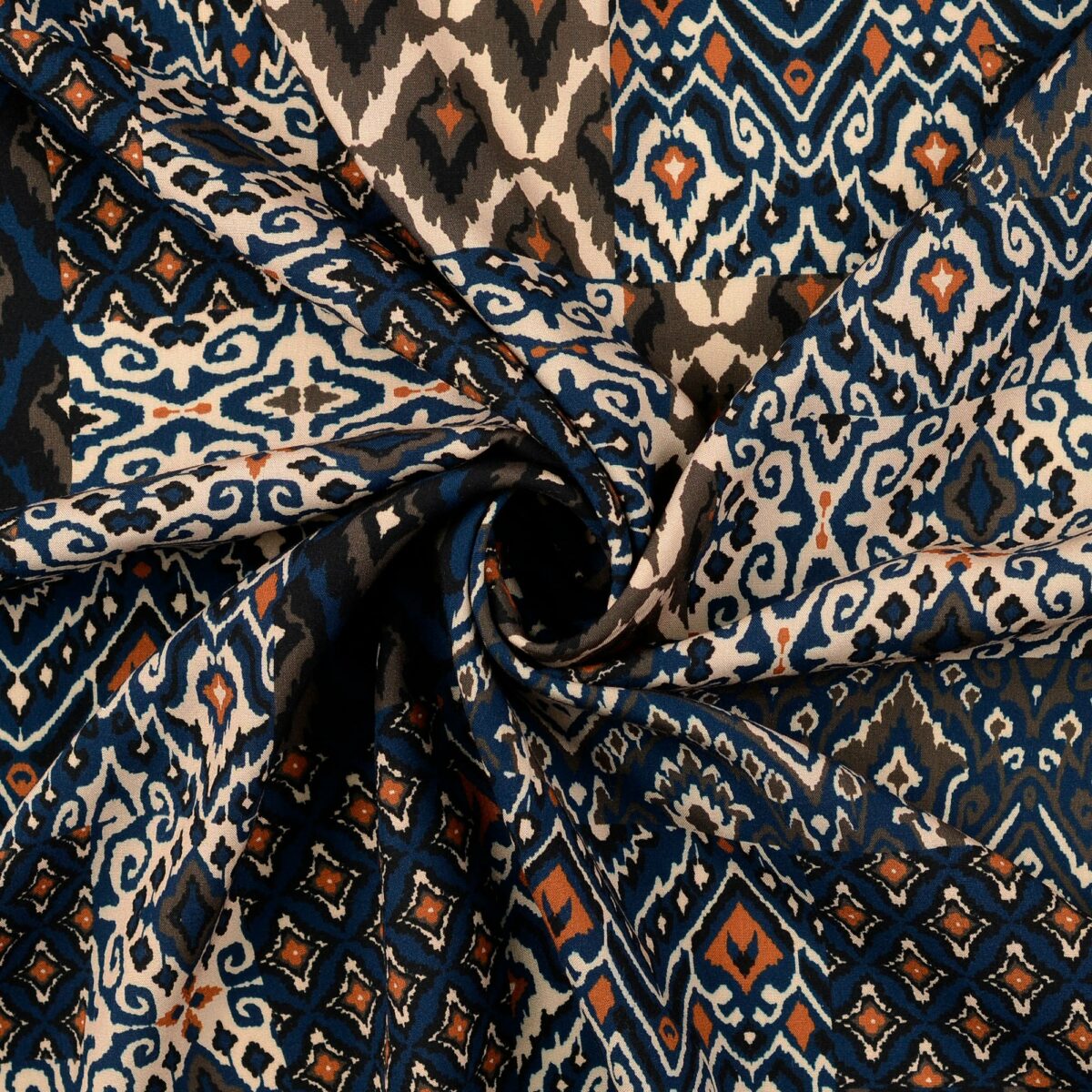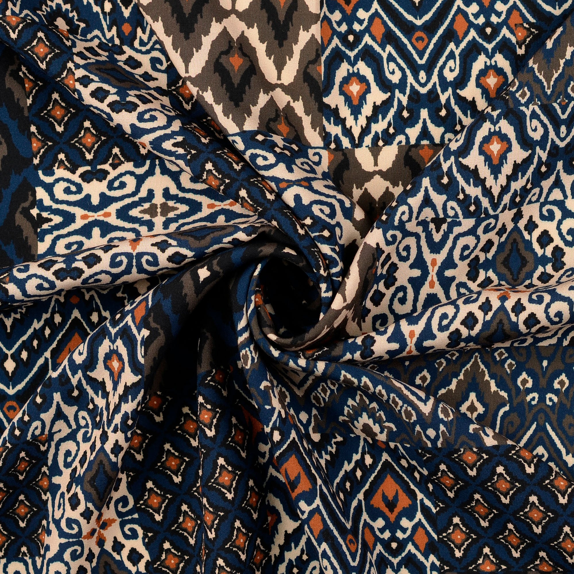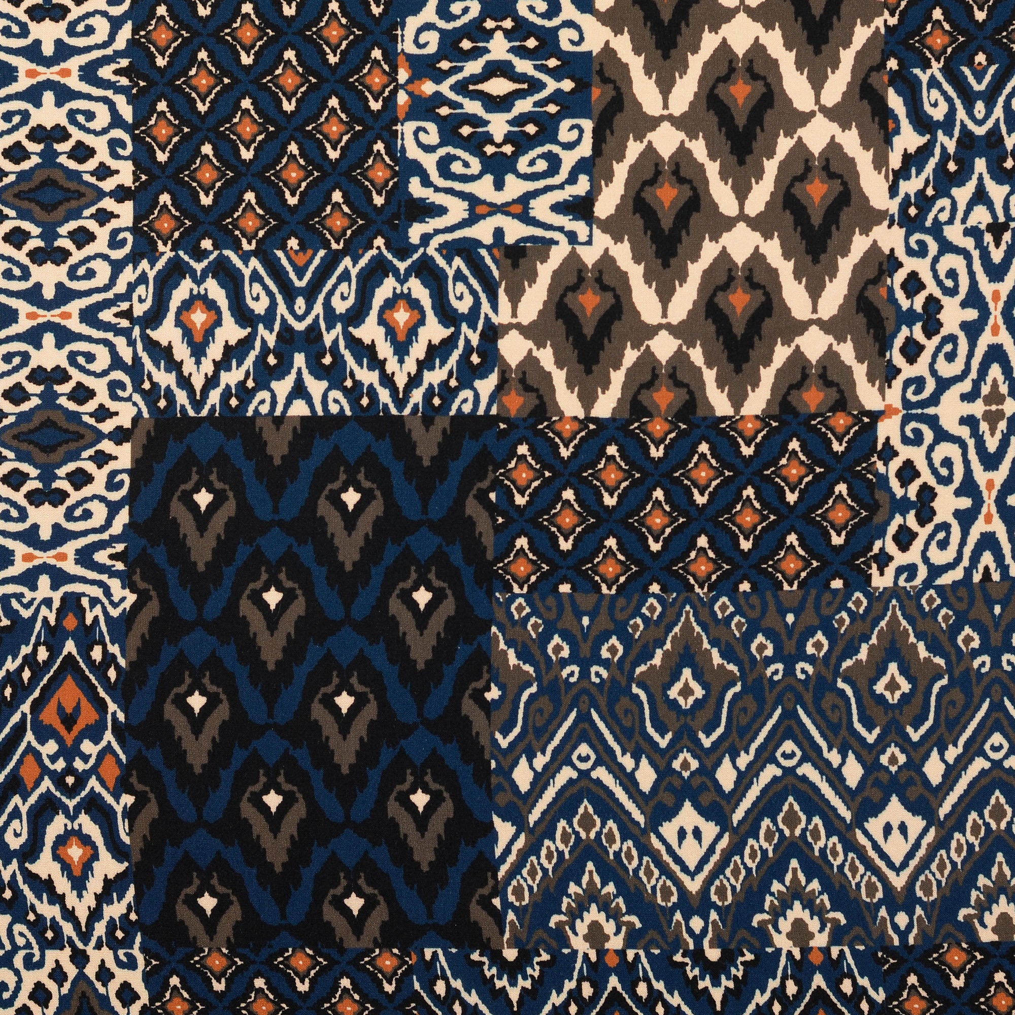 Ikat är malajiska och betyder binda, knyta, vira om. Genom att just använda sig av denna traditionella infärgningsteknik, så skapas dessa vackra enkla mönster. Givetvis är inte denna så avancerat tryckt, nej, men fin är den. Viskospoplin? Jo, det är en riktigt tätvävd ”vanlig” viskos. Den har ett lika bra fall, är mjuk och behaglig men är inte fullt lika ”fladdrig”. Förutom den där blusen, så kan du tänka dig vida byxan, byxdressen, kaftanen, långskjortan, klänningen etc.