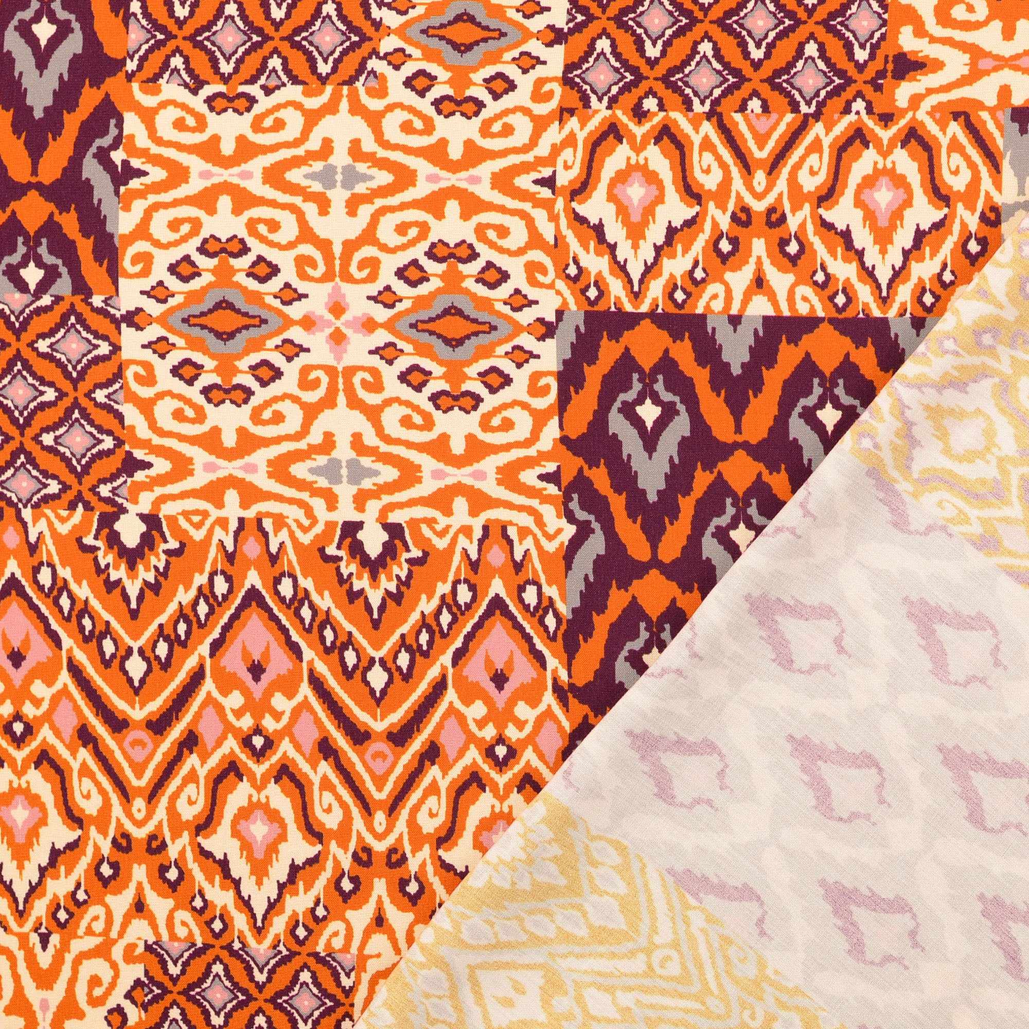 Ikat är malajiska och betyder binda, knyta, vira om. Genom att just använda sig av denna traditionella infärgningsteknik, så skapas dessa vackra enkla mönster. Givetvis är inte denna så avancerat tryckt, nej, men fin är den. Viskospoplin? Jo, det är en riktigt tätvävd ”vanlig” viskos. Den har ett lika bra fall, är mjuk och behaglig men är inte fullt lika ”fladdrig”. Förutom den där blusen, så kan du tänka dig vida byxan, byxdressen, kaftanen, långskjortan, klänningen etc.