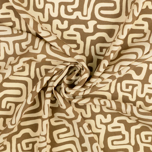 Är det fornlämningar, ett hemligt språk eller bara kludd? Viskospoplin? Jo, det är en riktigt tätvävd ”vanlig” viskos. Den har ett lika bra fall, är mjuk och behaglig men är inte fullt lika ”fladdrig”. Förutom den där blusen, så kan du tänka dig vida byxan, byxdressen, kaftanen, långskjortan, klänningen etc.