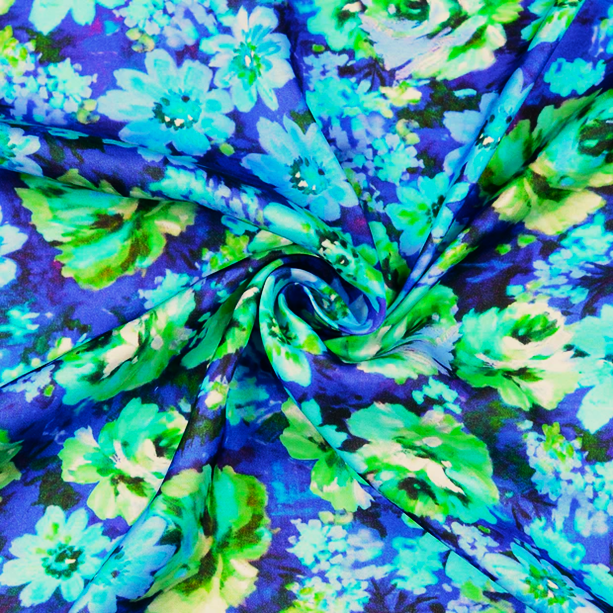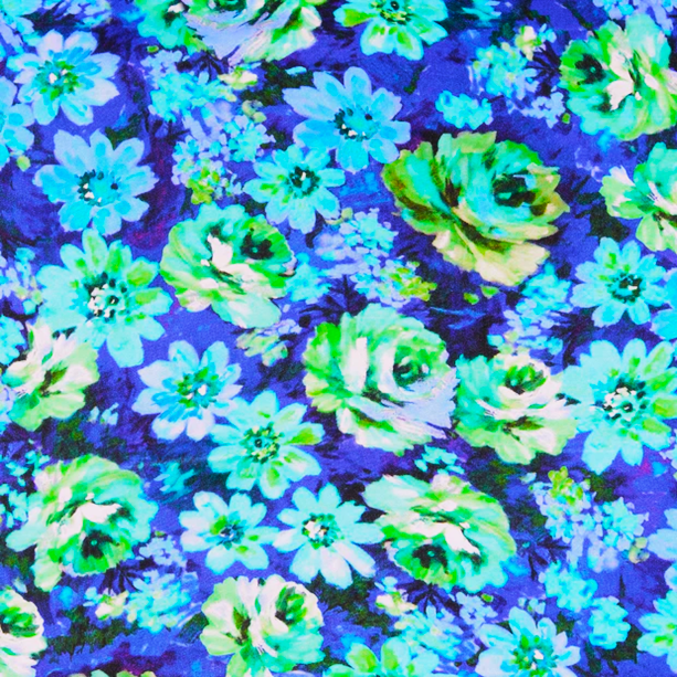 Om du söker färg, blommor och allmänt välbehag, ja då har du hittat rätt till slut. Här har du ett mjukt, mjukt (nästan löjligt gött) och svagt glansigt vävt tyg med sidenkänsla. Största blomman är ca 7cm. Tänk dig blusen, scarfen, kaftanen, långskjortan, klänningen etc.