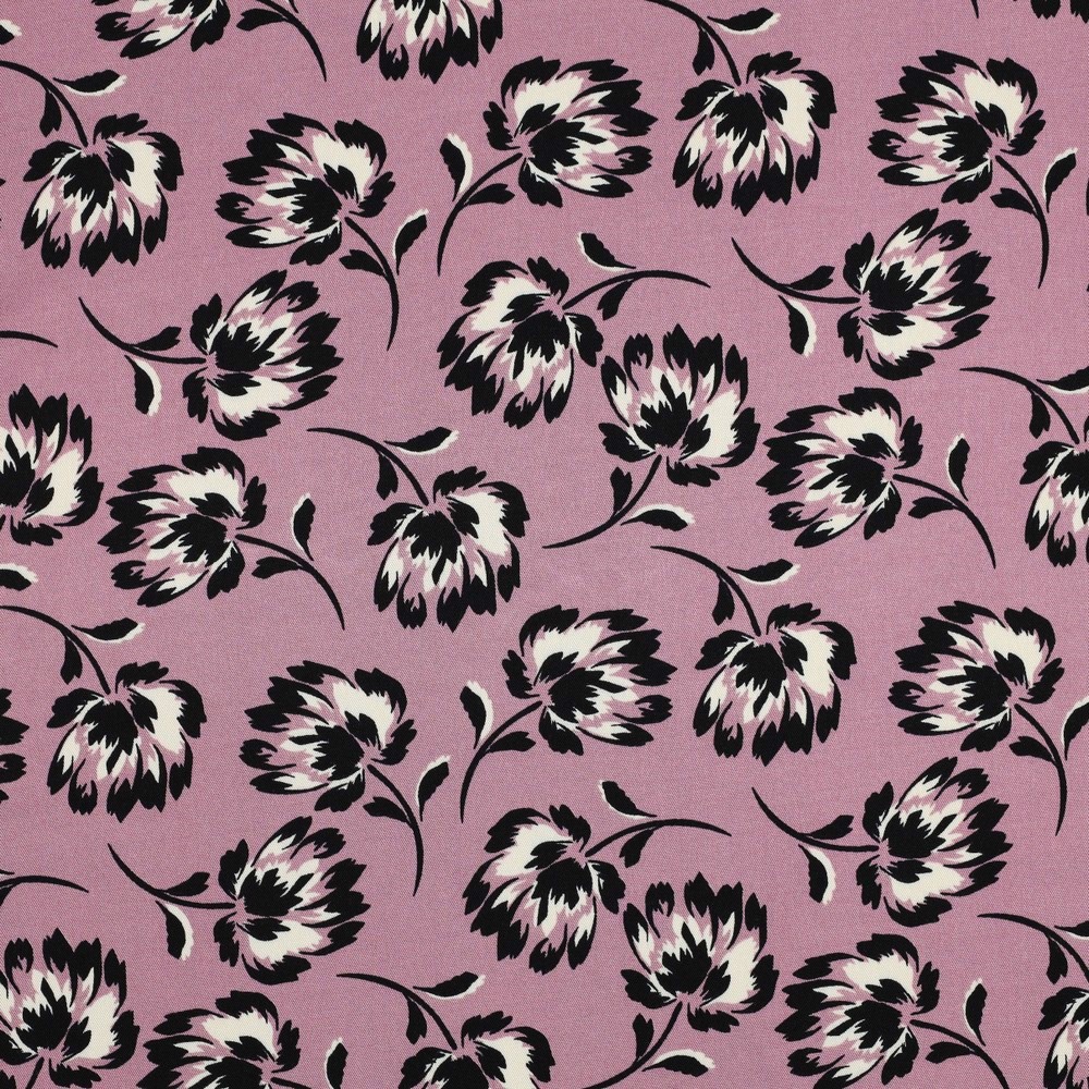 Väldigt trevlig och härligt fladdrig viskostwill (kypertvävd) med bra fall och lite stretch. Den vackra blomman är ca 5cm stor. Förutom den där blusen, så kan du tänka dig vida byxan, byxdressen, kaftanen, långskjortan, klänningen etc.